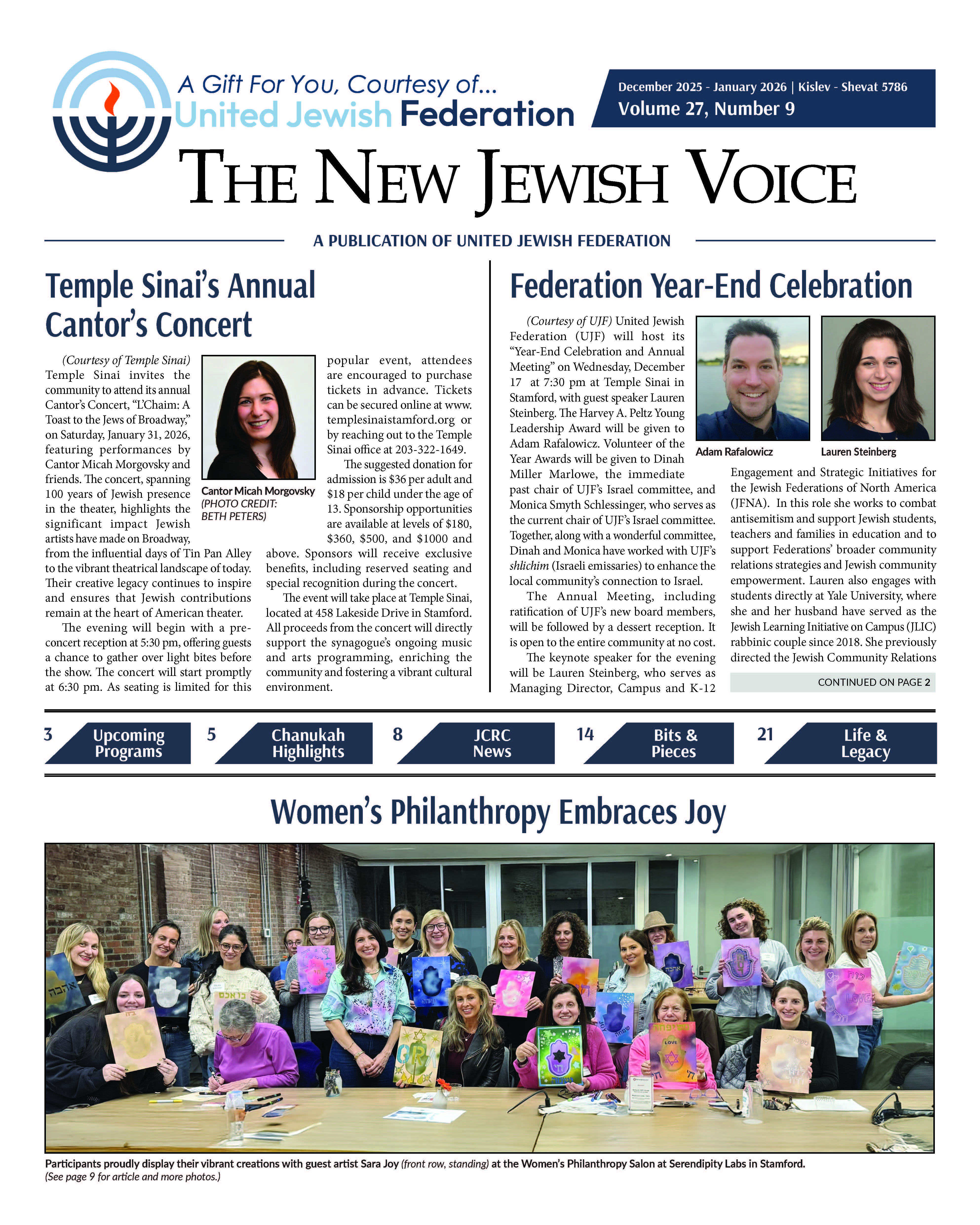 As we close 2025, this issue of The New Jewish Voice highlights key milestones shaping our community. Don’t miss our Annual Meeting featuring guest speaker Lauren Steinberg, and single out this year’s Harvey A. Peltz Award winner, Adam Rafalowicz, who has served as UJF’s treasurer for the past three years. Steinberg serves as Managing Director, Campus and K-12 Engagement and Strategic Initiatives for the Jewish Federations of North America (JFNA). With reflections from leadership and updates on advocacy and fundraising, this edition showcases the strength and resilience of our Jewish community. Read these stories and more in The New Jewish Voice!