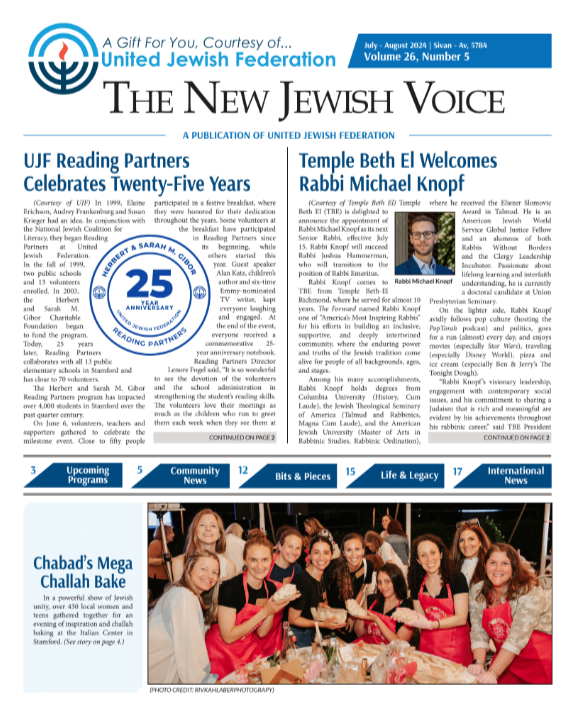 With summer officially underway, The New Jewish Voice newspaper is back with a double-issue for July and August. Look back on 25 years of UJF's Reading Partners program, celebrating 4 years of Life & Legacy, upcoming PJ Library and NextGen events for the whole family, and a BIG save the date as UJF and UJA-JCC Greenwich host "A Conversation with Michael Rapaport" on Sunday, September 15 at Rippowam Middle School. All of this news and much more in The New Jewish Voice!