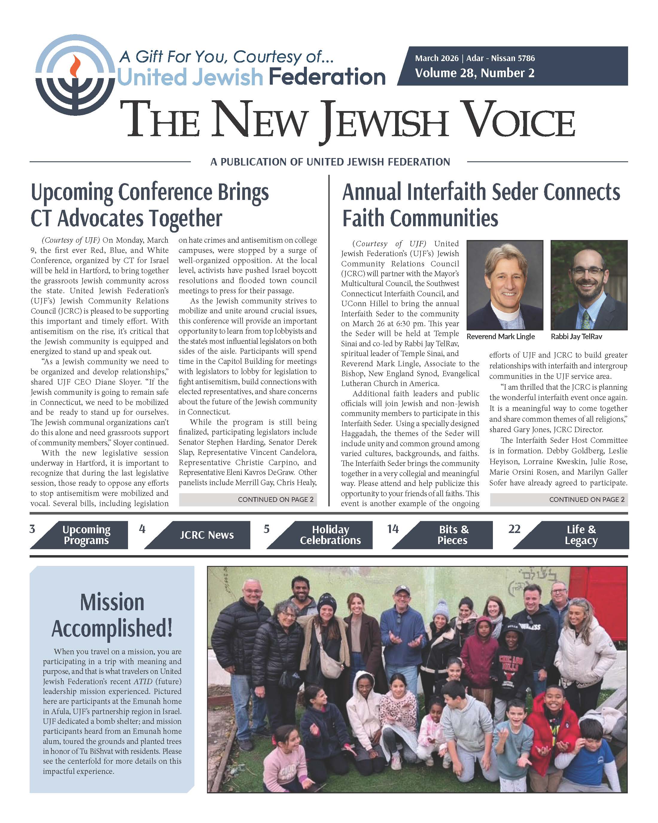 In this issue of The New Jewish Voice, we celebrate the vibrancy, resilience, and unity of our community during these late winter months. From meaningful reflections on rebuilding Israel and strengthening Jewish identity, to uplifting gatherings that brought generations together for Tu Bishvat, Purim, and community Shabbat celebrations, this edition highlights the many ways our community shows up for one another. We are inspired by the dedication of our clergy, lay leaders, volunteers, and partner organizations who continue to foster connection through learning, service, advocacy, and celebration. Whether honoring our shared history, deepening interfaith relationships, supporting families in need, or preparing Passover traditions, these stories reflect the enduring spirit and collective commitment that define Jewish life in Stamford, New Canaan, Darien, and beyond.